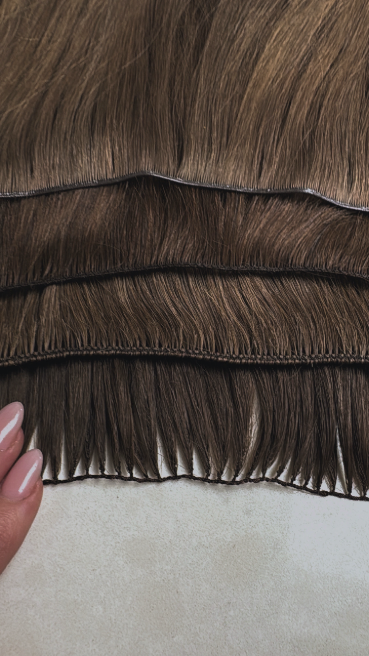 Our wefts are carefully crafted by hand, small, lightweight that allows for the thinnest and most discreet wefts possible. Because they’re handmade, they sit extremely flat against the scalp, making them perfect even for clients with fine or thin hair.
